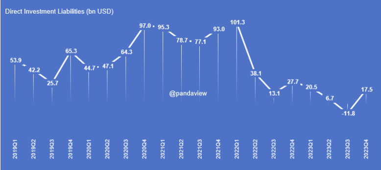 据国家外汇管理局统计,2023年四季度,入境FDI(外商直接投资)较2023年三季度为负值快速回升。