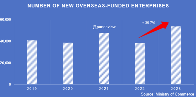 而更有趣的数据是2023年新增外资企业总数出现大幅增长。