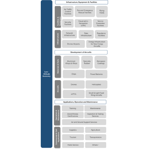 中国低空市场涵盖无人机、电动垂直起降、航材等各个领域,以及航拍、农业、物流、基础设施巡检、环境监测、娱乐等应用。