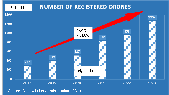 例如,根据中国民航局的数据,到2023年,注册无人机数量已达到126.7万架,2018年至2023年复合年增长率为34.6%。无人机是低空市场的主要飞机,应用广泛。中国现在在这个领域处于领先地位。