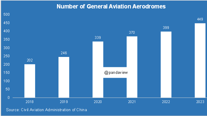 另一个例子是通用航空机场的发展。到2023年,通用航空机场达到449个。机场是通用航空活动的重要基础设施之一。