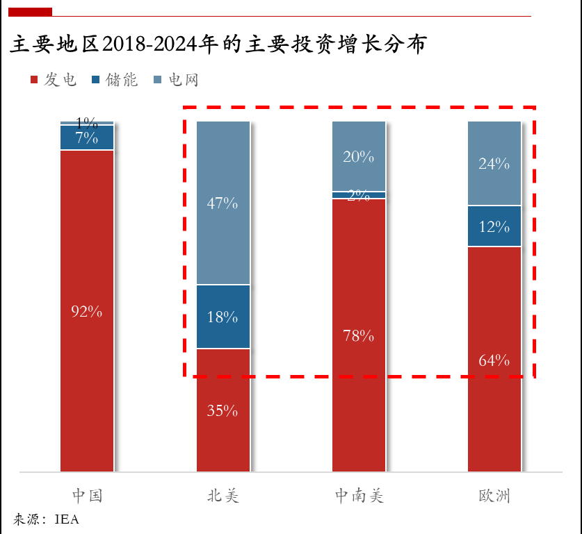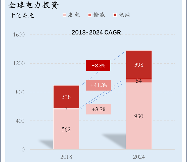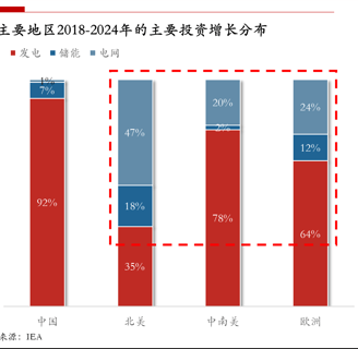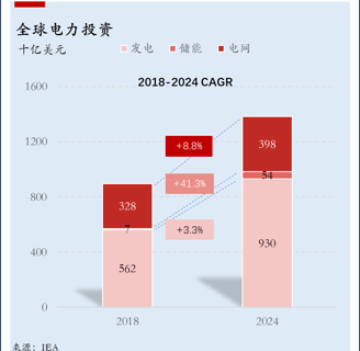 根据IEA的数据,全球电力投资从2018年到2024年总体呈现了稳定增长的趋势。按板块细分,储能端投资增速迅猛,达到41.3%,电网建设位列第二,发电端投资较缓。
